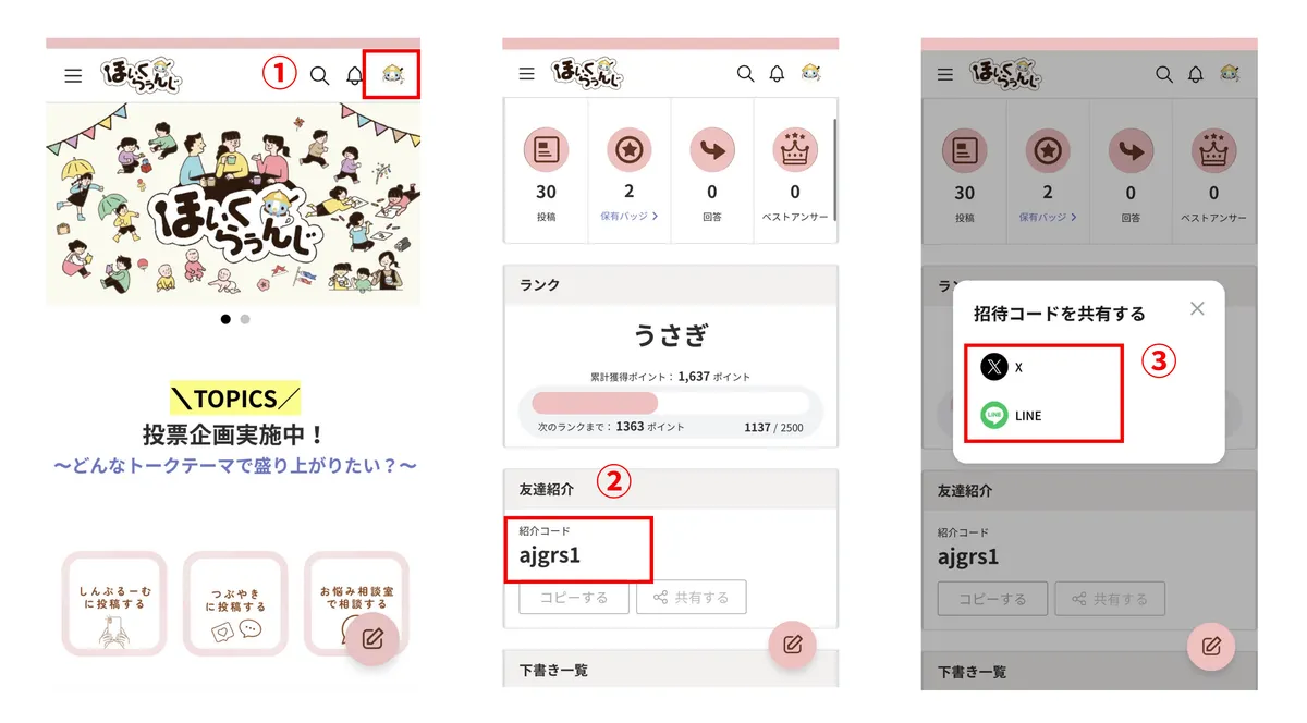 ③「共有する」からXやLINEで紹介コードをお友達に送る。