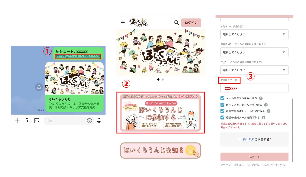 ②「ほいくらうんじに参加する」のボタンから会員登録画面に進む。