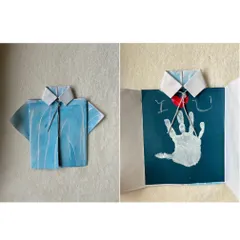 先日はわたしの父の誕生日でした🎂ふと保育士一年目の時に作った父の日の製作を思い出し、初投稿します! ワイシャツを開けるとこどもの手形が出てくるちょっとサプライズのあるプレゼントです🎵 2歳児クラスでこどもたちと白いクレヨンで一緒に線を引いたり青い絵の具を塗ったり、ドキドキしながら